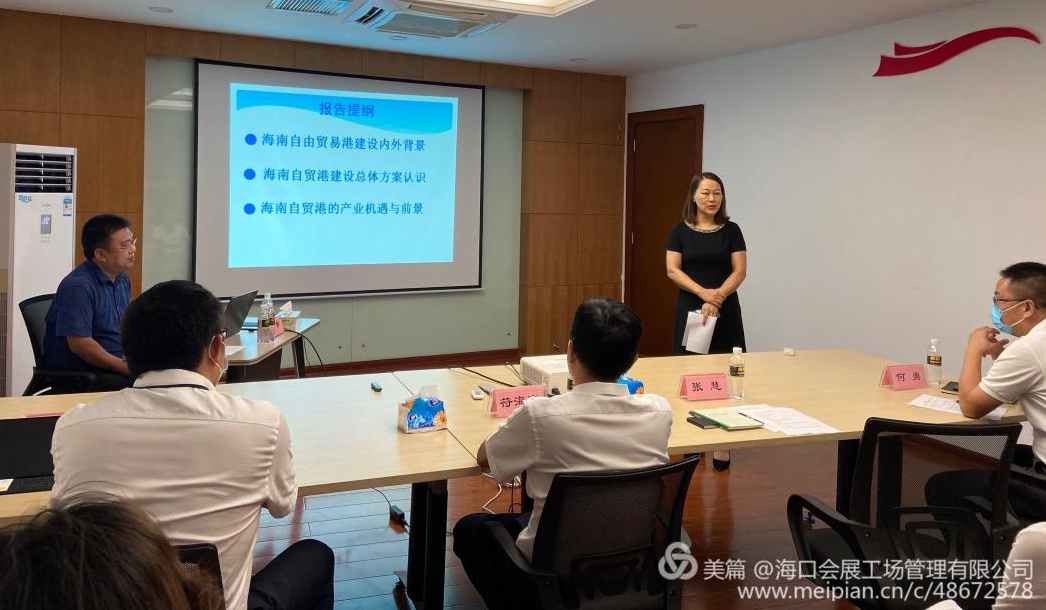 为积极响应海南自贸港建设的时代号角,帮助员工更好的理解自贸港建设总体方案及政策利好,会展工场管理公司近日组织开展了一系列自贸港建设总体方案的学习活动。7月27日,特邀海南师范大学中国特色自由贸易港研究中心主任、海南省社科院研究专家刘锋教授,以海南自由贸易港建设与产业发展机遇为题召开讲座。会展工场管理公司总经理张慧主持专题讲座并做开场致辞,董事长符海宇及各部门员工共计26人参加。
