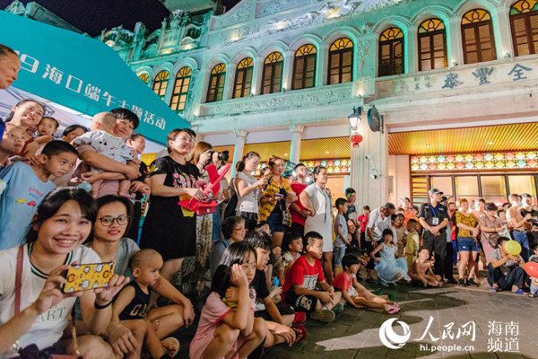 在演出间隙,各项体育竞技正在如火如荼开展。当晚,一项项结合端午文化的特色竞技游戏,吸引了大批观众参加。钓粽子、旱地划龙舟、掷粽子沙包、手忙脚乱大比拼等等,比赛过程紧张激烈。记者在现场看到,参与者大展拳脚,围观者呼声阵阵,骑楼老街处处弥漫着欢声笑语。